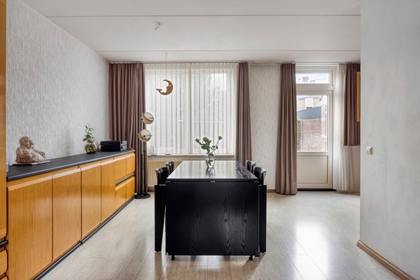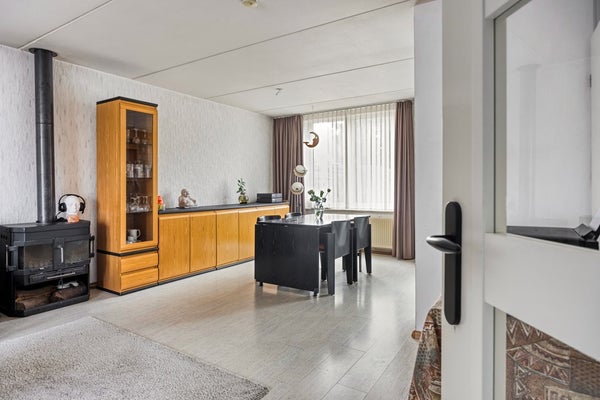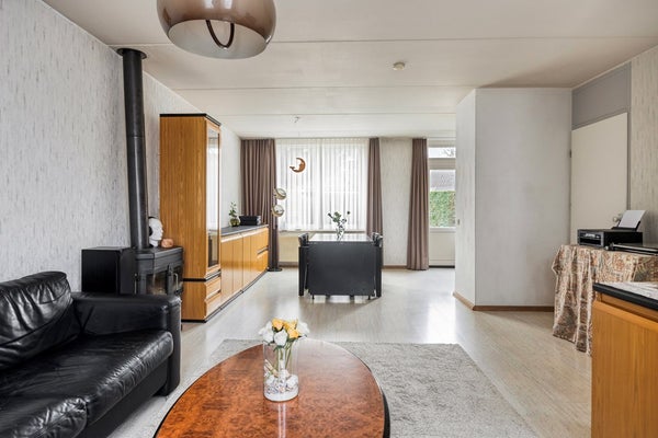 De royale doorzonwoonkamer (31m²) is afgewerkt met een laminaatvloer en beschikt over een praktische trapkast. Dankzij de grote raampartijen aan zowel de voor- als achterzijde geniet de ruimte van veel natuurlijke lichtinval. In de woonkamer bevindt zich tevens een houtkachel (momenteel niet functionerend). De woonkamer is voorzien van kunststof kozijnen met isolerende HR++ beglazing en staat in open verbinding met de keuken.
