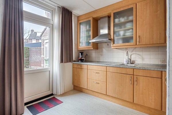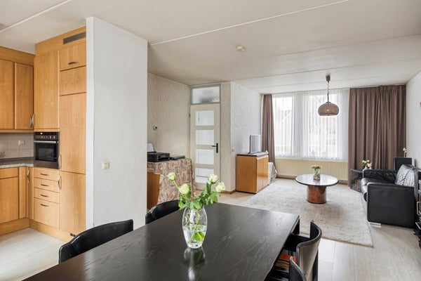 De open keuken (6m²) is uitgevoerd in een hoekopstelling en voorzien van een kunststof aanrechtblad, een 4-pits inductiekookplaat met afzuigkap (2020), een combi-oven, koelkast en vriezer met twee laden en vaatwasser. Via een openslaande deur biedt de keuken directe toegang tot de achtertuin.