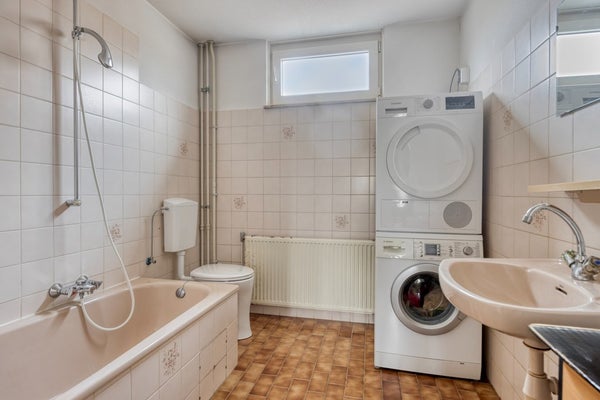 De badkamer (6m²) is voorzien van natuurlijke daglichttoetreding en is praktisch ingericht met een ligbad met douchefunctie, een vaste wastafel, een staand closet en de aansluiting voor de wasmachine. De ruimte biedt een goede basis en kan gemoderniseerd worden naar eigentijdse wensen.
