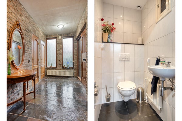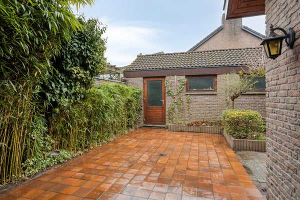 Betreed de hal met een (op dit moment afgesloten) trap naar boven, een apart toilet, toegang tot de kelder, de woonkamer en de meterkast binnen handbereik. De betegelde toiletruimte is voorzien van een wandcloset en fonteintje. De woonkamer is verbonden met een semi-open keuken, mooi ingericht in een L-vorm. De benedenverdiepingsvloer is verfraaid met Indische leistenen, degelijk en luxe. Geniet van de gezellige sfeer in de woonkamer, met de oude elementen en de houtenbalken, met een slimme opzet, perfect om een comfortabele zithoek te creëren en aan de voorzijde van het huis een ruime eethoek te hebben (of andersom). De (gesloten/Siemens)keuken, voorzien van boven- en onderkasten, bevindt zich aan de achterkant van de woning en is compleet uitgerust met een inductiekookplaat een afzuigkap met verlichting, een vaatwasser, een koelkast en een combi-oven. Via de aanbouw en de semi-open keuken stap je direct de volledig omheinde, betegelde en groene tuin in, compleet met een zeer ruime garage. Deze tuin is op het zuidwesten gelegen, omringd door bomen en is tevens bereikbaar via een achterom dat direct links naast de garage ligt.