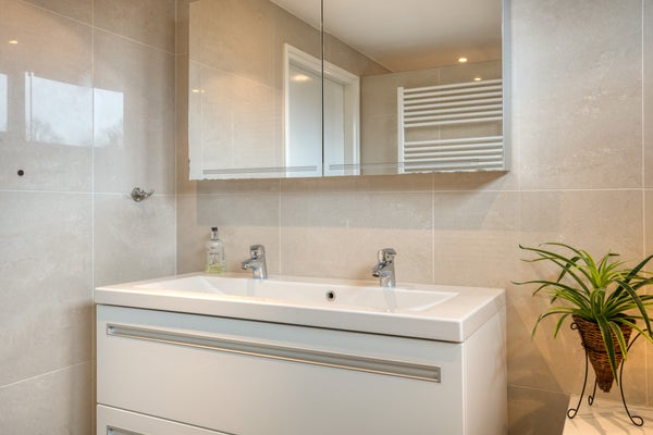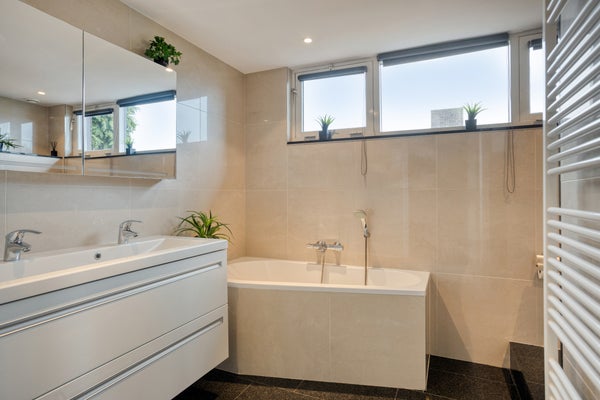 De badkamer is uitgerust met een zitbad en een douche, een tweede toilet en een wastafel met badkamermeubel, inclusief voldoende stopcontacten en verlichting. De badkamer is met degelijk materiaal circa 15 jaar geleden aangelegd, stijlvol en tijdloos.