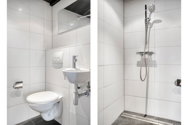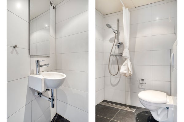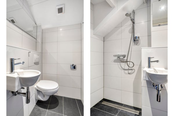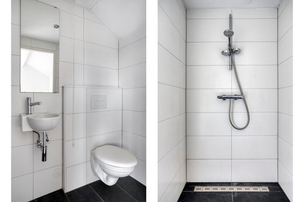 De badkamers zijn volledig betegeld, praktisch ingedeeld en voorzien van een douche, wandcloset en wastafel. In de huidige situatie beschikt elke slaapkamer over een eigen badkamer. Desgewenst is het mogelijk om deze samen te voegen tot één royale badkamer; zie hiervoor de plattegronden verderop in de brochure.