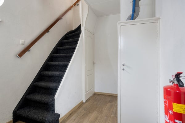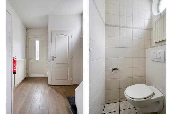 Bij binnenkomst in de nette entreehal treft u de trapopgang naar de eerste verdieping, toegang tot de kelder, de meterkast en een volledig betegelde toiletruimte met wandcloset en radiator. Vanuit de hal bereikt u de ruime woonkamer.