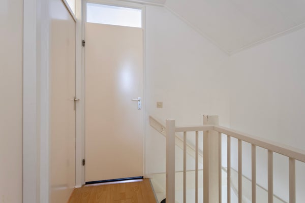 Deze verdieping beschikt over een overloop die leidt naar twee comfortabele slaapkamers, één kleinere slaapkamer en de basic badkamer. Slaapkamer een (master, gelegen aan de voorzijde van de woning. Slaapkamer twee, gelegen aan de achterzijde. Slaapkamer drie, gelegen aan de voorzijde. De badkamer is voorzien van wandtegel, wastafel, toilet en een bad. Bereik de bergzolder middels een vlizotrap, gesitueerd in een van de slaapkamers.