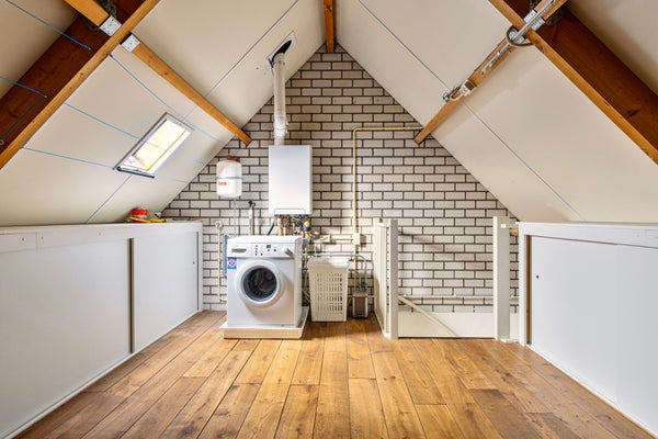 Ruime, open zolder welke erg handig te gebruiken is voor multifunctionele doeleinden. Je vind hier eveneens de recent vernieuwde CV-installatie, alsmede de witgoedaansluitingen.