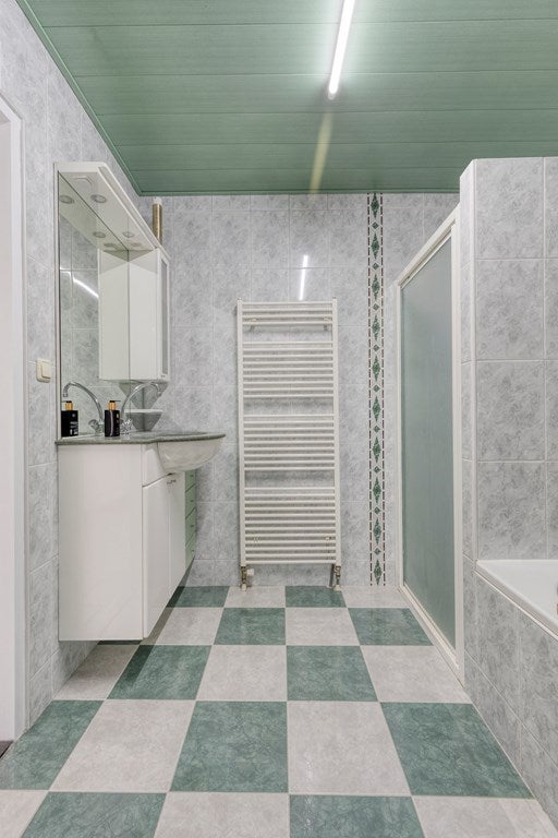 De complete badkamer is voorzien van toilet, ligbad, inloopdouche en wastafelmeubel.
