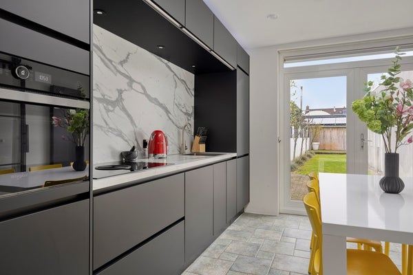 De open keuken, het pronkstuk van deze woning, is voorzien van een moderne opstelling en beschikt over onder andere een vaatwasser, combi-oven, koelkast en een Bora inductie kookplaat met geïntegreerde afzuiging. De marmer look accenten geven de keuken een luxe en eigentijdse uitstraling. Door de lichtkoepel is er veel licht, ideaal voor tijdens het koken.