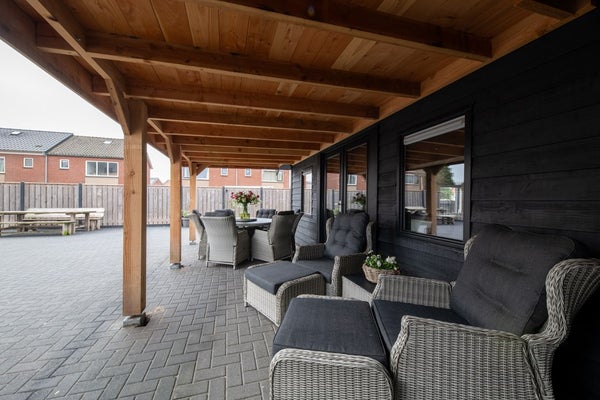 Direct grenzend aan de keuken is een overkapping gerealiseerd – een heerlijke plek om beschut te genieten van het buitenleven, van ’s ochtends vroeg tot ’s avonds laat. Achter in de tuin bevindt zich een sfeervolle vijver, die zorgt voor een rustgevende ambiance en een vleugje natuurlijke charme.