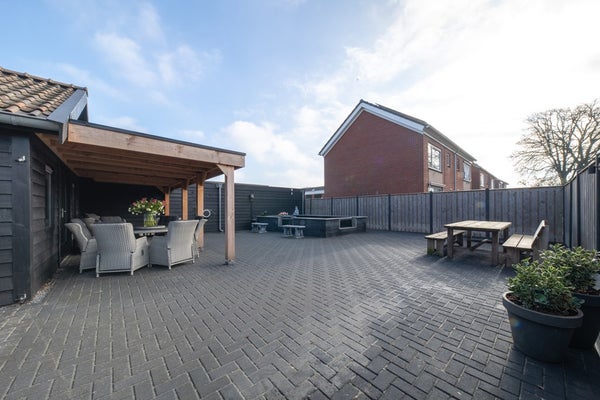 De tuin is nagenoeg volledig verhard en daardoor zeer onderhoudsarm ingericht. De sfeervolle vijverpartij zorgt voor een rustgevend en verzorgd geheel. Dankzij de ruime overkapping is het hier al vroeg in het voorjaar en tot laat in het najaar heerlijk genieten van het buitenleven. Of u nu wilt ontspannen of gezellig wilt borrelen met familie en vrienden – deze tuin biedt volop mogelijkheden. Aan weerszijden van de woning bevindt zich een oprit, waardoor er ruim voldoende parkeergelegenheid op eigen terrein is.