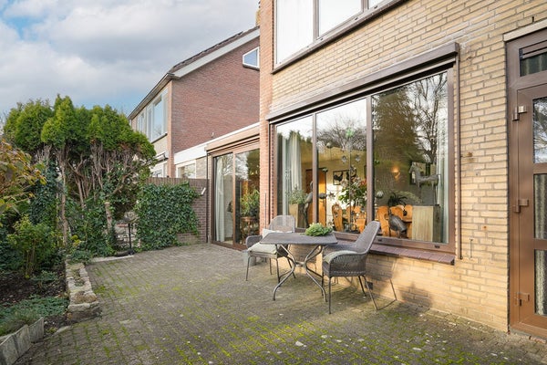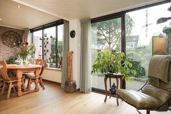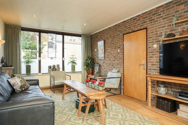 In het verleden is een deel van de voormalige garage bij de woonkamer getrokken waardoor er een extra ruimte is ontstaan en een extra bergkast. Via de schuifpui is de tuin bereikbaar.