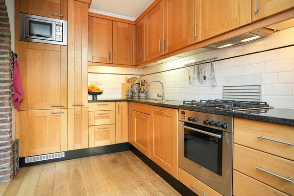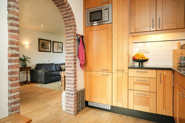 Via een toog bereik je de halfopen keuken aan de achterzijde. De keuken is uitgevoerd in hout met een granieten werkblad en is uitgerust met een koelkast, vriezer, magnetron, vaatwasser, een 4-pits gaskookplaat en een inbouw afzuigkap. Extra bergruimte is er door een apothekerskast en een carrousel.