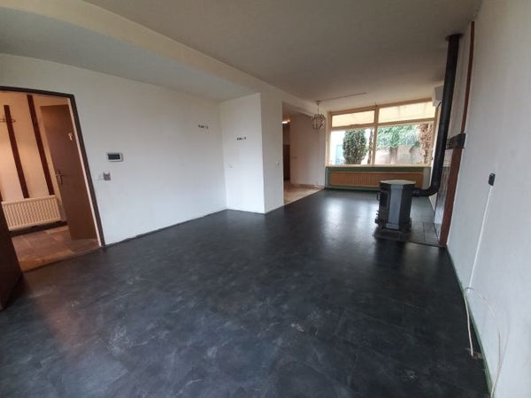 Indeling: Hal met meterkast en toilet. Open keuken (+/- 17 m2)met apparatuur en voorzien van tegelvloer. Doorzon woonkamer (+/- 34 m2) met dubbelglas en rolluiken en voorzien van PVC vloer. Vanuit de keuken toegang tot de tuin met overkapping en garage. 1e Etage: 3 slaapkamers (+/- 2.98 x 2.32 m/3.9 x 3.45 m/2.58 x 3.9 m), Badkamer (+/- 2.3 x 3 m)met ligbad, douche en wastafel. Separaat toilet met wasruimte. De zoldervliering is via een vlizotrap te bereiken. Daar staat ook de HR CV (eigendom 2013).