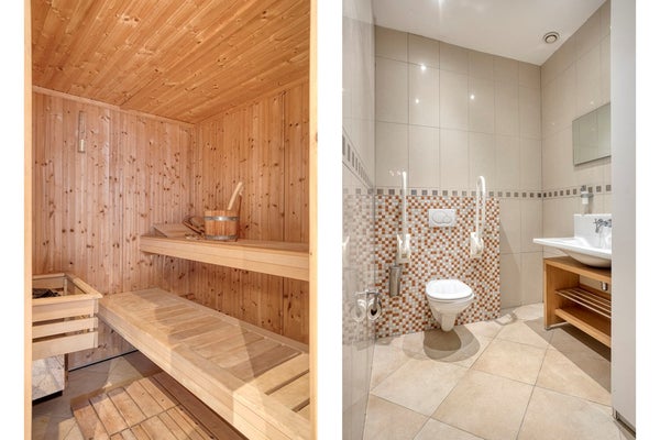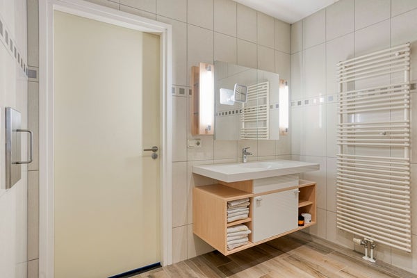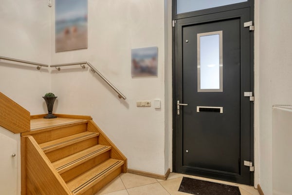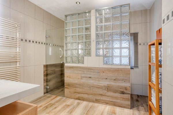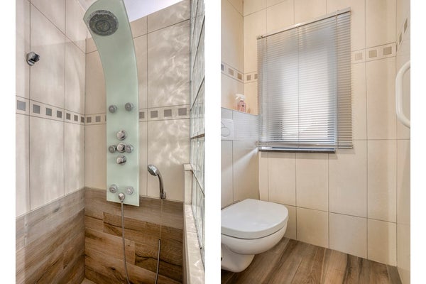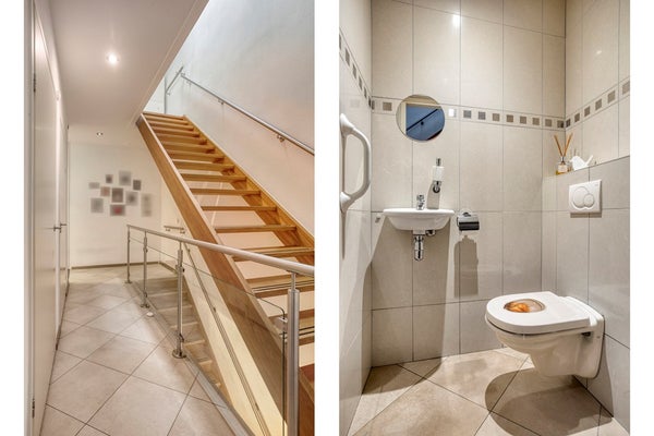 De badkamer is keurig afgewerkt en voorzien van een inloopdouche met massagefunctie, tweede toilet, wastafelmeubel met wastafel, radiator en praktische waskoker: uw was komt rechtstreeks in de wasruimte uit.