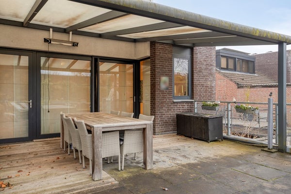 Vanuit de eetkamer en de keuken is het terras met overkapping en buitenkeuken te bereiken. Achter het terras bevindt zich de ruime, op het noord-west gelegen tuin die onderhoudsvriendelijk is aangelegd. In de hoek van de tuin is een trap naar beneden om in de patio te geraken.