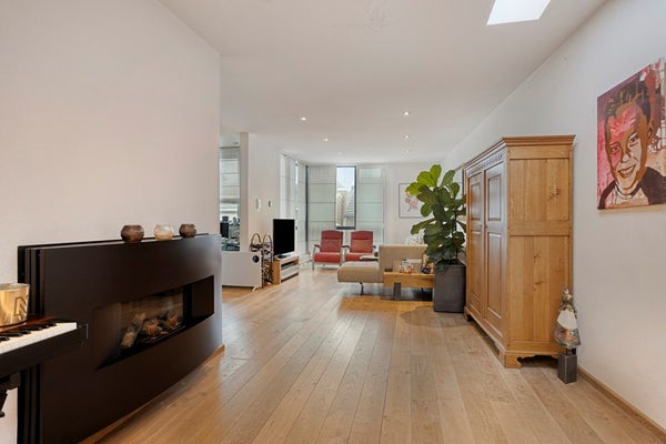 In het middengedeelte van de leefruimte is het heerlijk vertoeven voor de gashaard. Er is extra lichtinval gecreëerd door de twee smalle lichtkoepels.