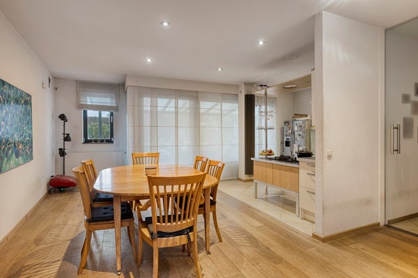 in het achterste deel van de leefruimte is de eetkamer en de keuken gesitueerd. Door het open karakter van de keuken is er direct contact met de eetkamer. Ook hier is veel daglichttoetreding: in de achtergevel is veel glas verwerkt middels een grote schuifpui en deur naar het terras.