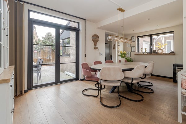 • L-vormige woonkamer (circa 33 m2) voorzien van een eikenhouten plankenvloer en fraaie cinewall. Een grote raampartij aan de voorzijde, voorzien van zonwering, zorgt voor veel lichtinval. Aan de achterzijde zorgen openslaande tuindeuren voor optimaal tuincontact.