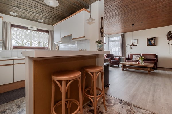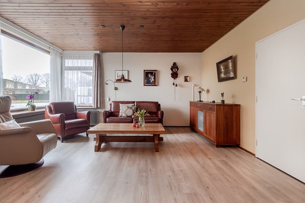 Aan de linkerkant van de woning ligt de verrassend ruime woonkamer. De mooie laminaatvloer zorgt voor een warme uitstraling. Grote raampartijen geven veel licht en bieden vrij uitzicht op de voortuin en het groene plein aan de overkant. Binnen en buiten lopen hier prettig in elkaar over.