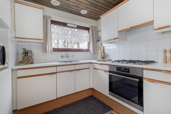 De compacte keuken ligt tegen de woonkamer aan en is praktisch ingericht. Alles heb je binnen handbereik: de vierpits gas kookplaat, de oven. Er is veel bergruimte in de kastenwand en hierin vind je ook de geïntegreerde koelkast. In de keuken en het eetgedeelte ligt een stijlvolle en onderhoudsvriendelijke tegelvloer.