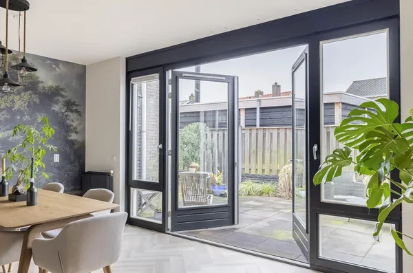 Bij binnenkomst in de hal, met PVC-vloer, heeft u toegang tot een separaat toilet, de garage en de ruime living. De lichte woonkamer van circa 24,5m² loopt door naar de moderne keuken, die van alle gemakken is voorzien. Aansluitend vindt u de eetkamer met openslaande deuren naar de achtertuin.