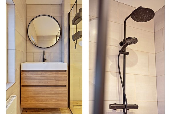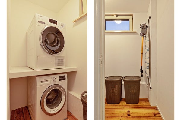 Op de eerste verdieping vindt u een overloop, twee ruime slaapkamers, een aparte wasruimte en een ruime, modern afgewerkte badkamer (2024). De badkamer, gerealiseerd in een voormalige slaapkamer, is uitgevoerd met een douche, toilet en een stijlvol badkamermeubel en is voorzien van vloerverwarming.