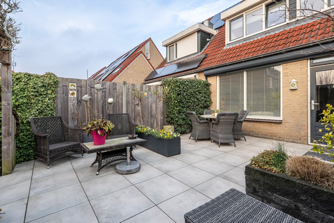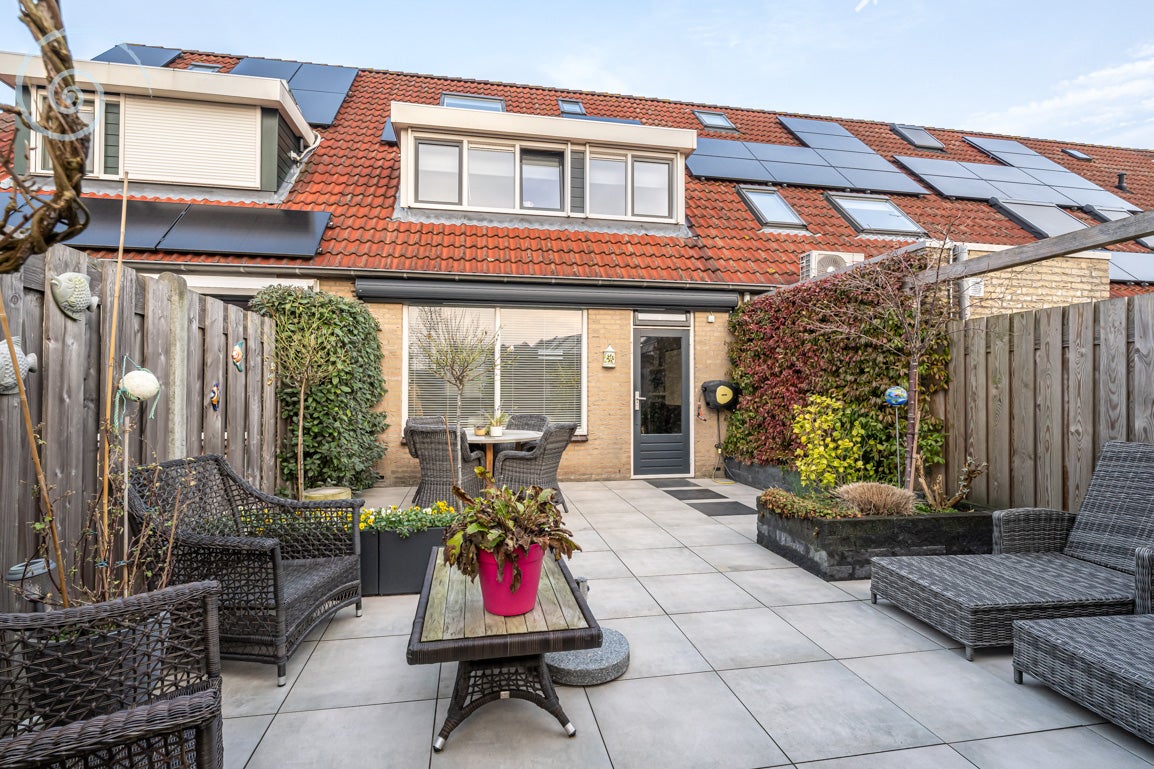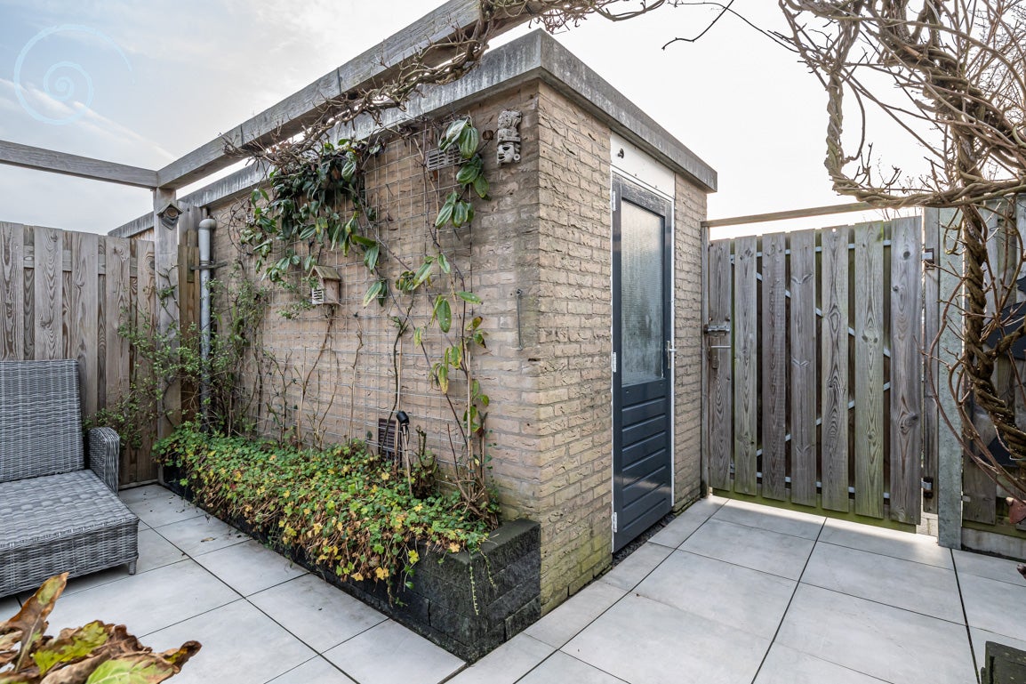 Achter het huis ligt een zonnige tuin, perfect voor ontspanning of gezellige avonden met vrienden. Een vrijstaande stenen berging biedt extra opslag voor fietsen en tuinspullen. De woning is voorzien van zes zonnepanelen en heeft energielabel B, wat zorgt voor lage maandlasten.