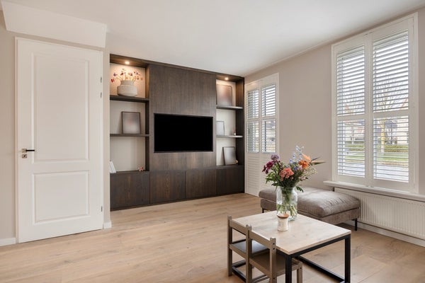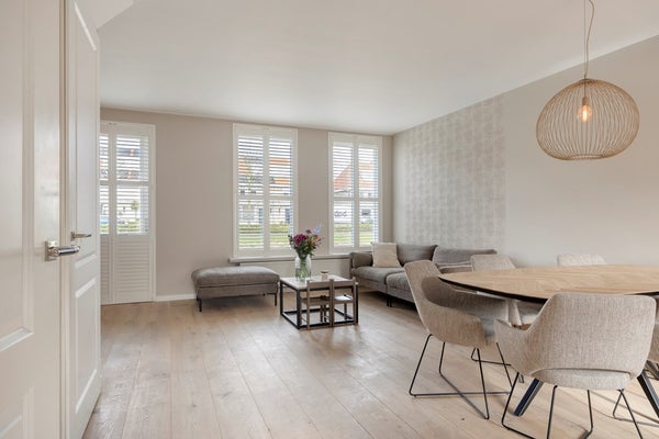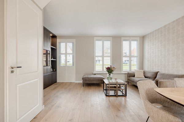 Via de entree met toilet en trapopgang kom je in de lichte woonkamer. Grote raampartijen zorgen voor een prettige verbinding met de tuin en laten het daglicht rijkelijk binnenstromen. De leefruimte voelt open en comfortabel.