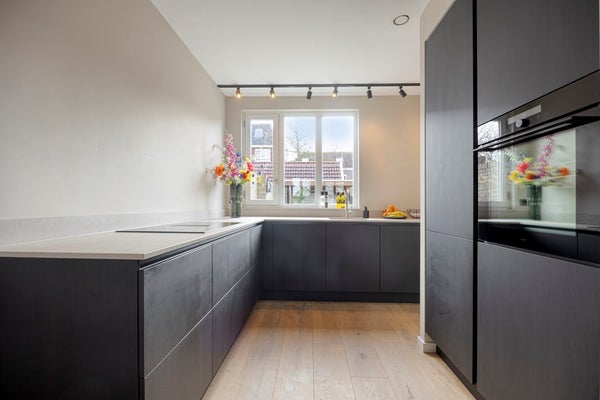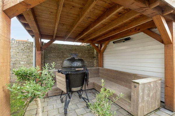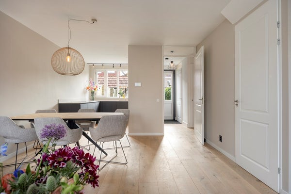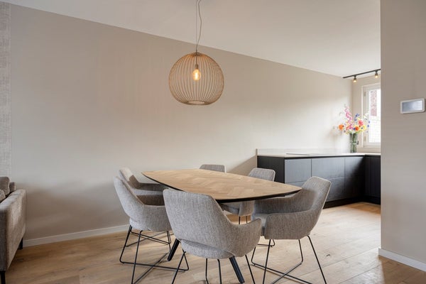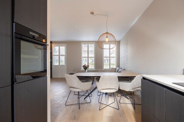Aan de achterzijde ligt de vernieuwde open keuken (2024), modern uitgevoerd en compleet met diverse inbouwapparatuur en geïntegreerde afzuiging. Vanuit de hal stap je zo de tuin in.