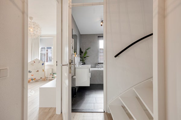 Op de eerste verdieping bevinden zich drie volwaardige slaapkamers en een verzorgde, moderne badkamer (2021) met ligbad, douche, toilet en dubbele wastafel, praktisch en stijlvol ingericht voor het hele gezin.