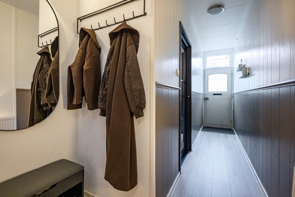 Laminaatvloer, radiator, meterkast en voorraadkast.