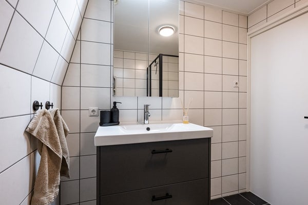 Plavuizenvloer, douchecabine, wastafel met meubel, radiator en geheel betegeld.