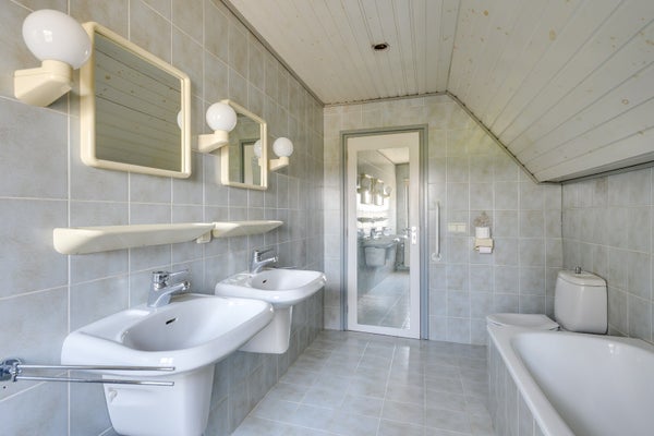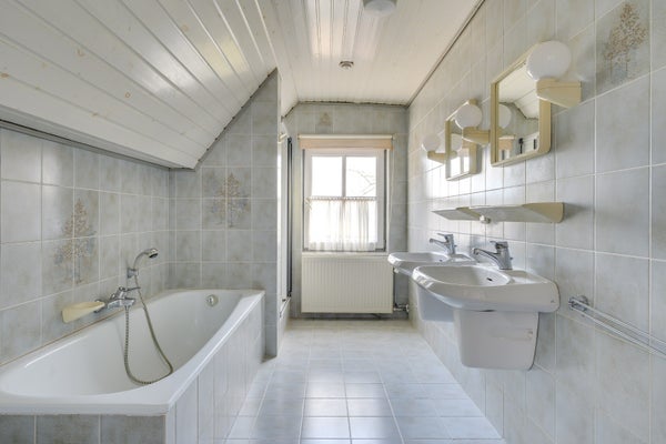 Complete geheel betegelde badkamer met ligbad, aparte douche, 2 wastafels, 2e toilet en raam met uniek vrij uitzicht.