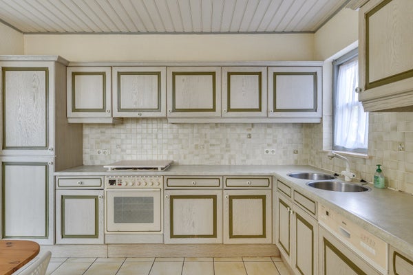 Sfeervolle eetkeuken ca 9m² met originele keukeninrichting v.v. kookplaat, afzuigkap, oven, koelkast, vaatwasser en ruimte voor eettafel.