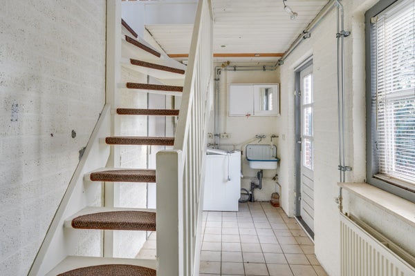 Deur naar ruime bijkeuken/portaal ca 7m2 met Nefit HR-cv-combiketel(‘13), aansluiting wasapparatuur, tuindeur, trap naar op verdieping boven garage gelegen werk/slaap-/speelkamer ca 17m2 en deur naar garage ca 18m² met dubbele garagedeuren. Vanuit garage deur naar aangebouwde tuinkamer/serre ca 15m² met dubbele tuindeuren naar royale achtertuin met uniek vrij uitzicht over landerijen.