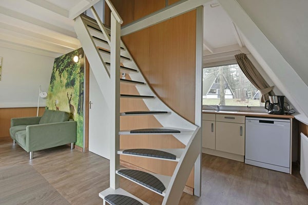 Je betreedt de woning via de hal die toegang biedt tot de lichte woonkamer. Hier vind je een open trap naar de verdieping en een schuifpui die leidt naar het terras aan de noordzijde en de omliggende tuin. De tuin rondom de woning zorgt voor een groene setting en een gevoel van rust en privacy. De open keuken grenst aan de woonruimte en is compleet ingericht met onder andere een gasstel, koelkast met vriesvak, combimagnetron en vaatwasser. Op de begane grond bevinden zich tevens een badkamer met douche en wastafel, een separaat toilet met wastafel en een praktische inpandige berging. Op de verdieping zijn twee comfortabele slaapkamers gesitueerd, beide voorzien van twee boxsprings en kastruimte, wat de woning zeer geschikt maakt voor een ontspannen verblijf van jouw gasten.