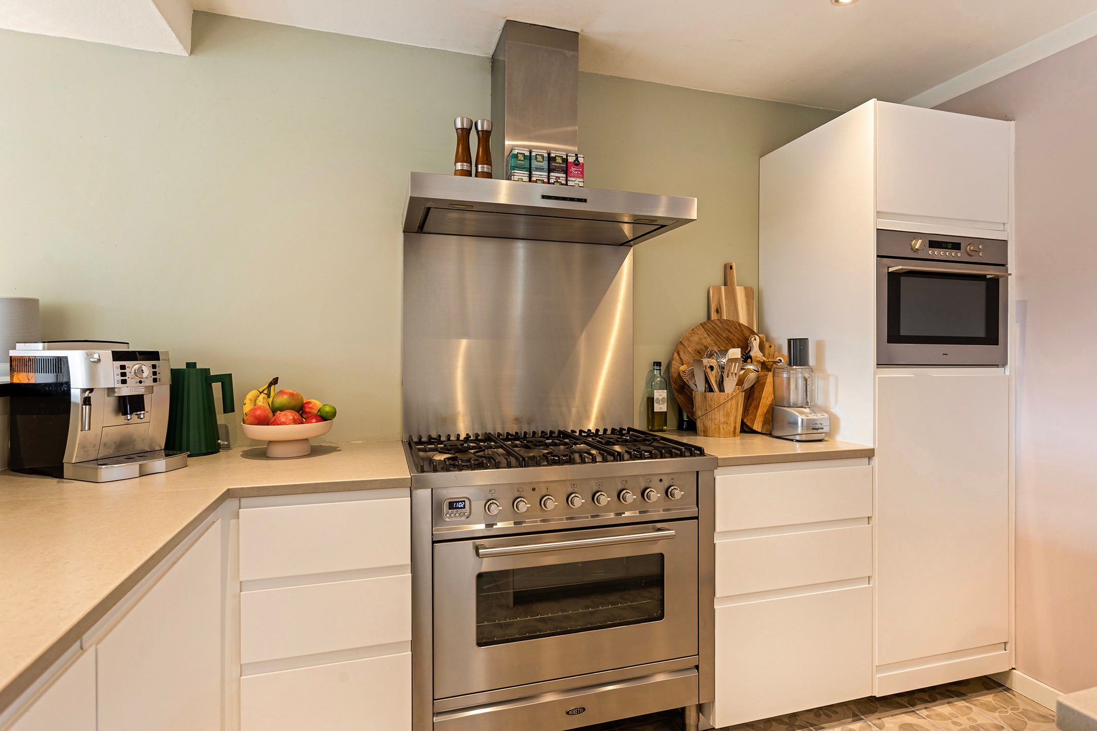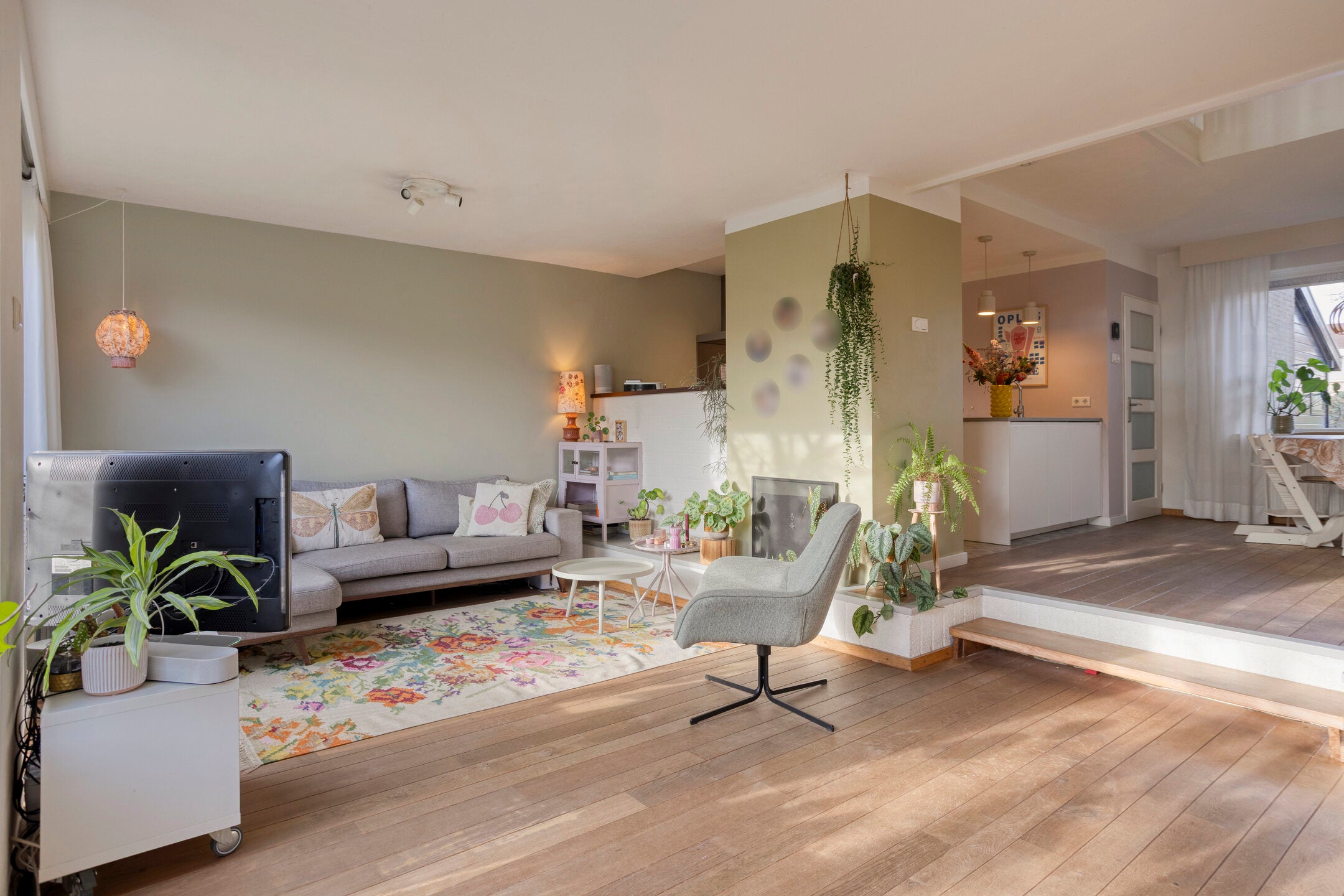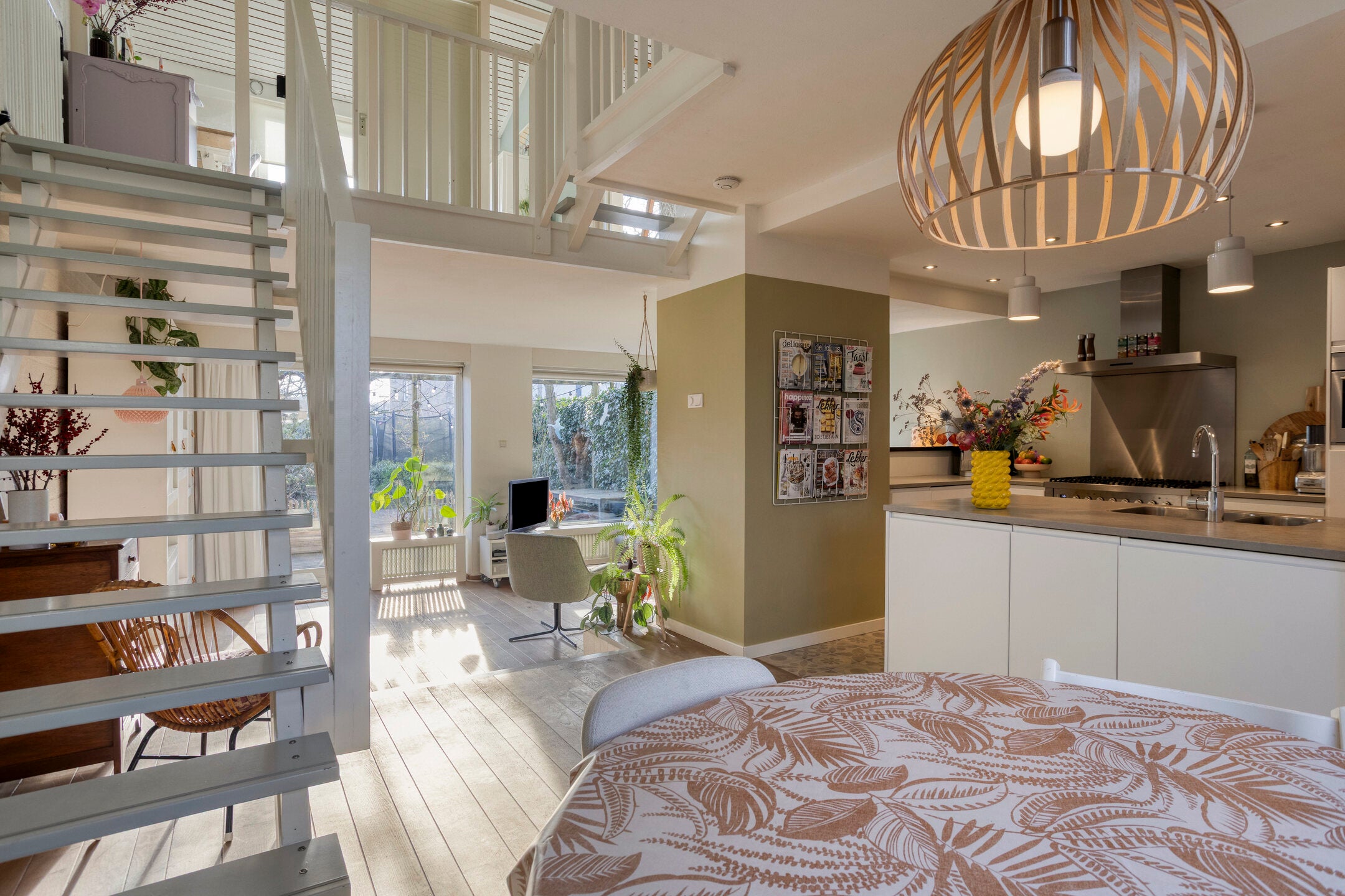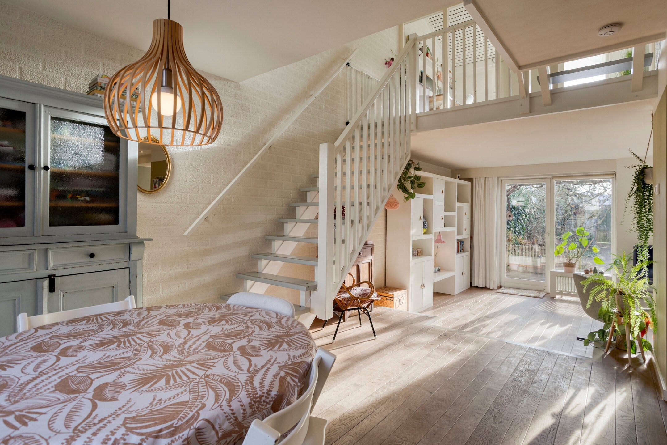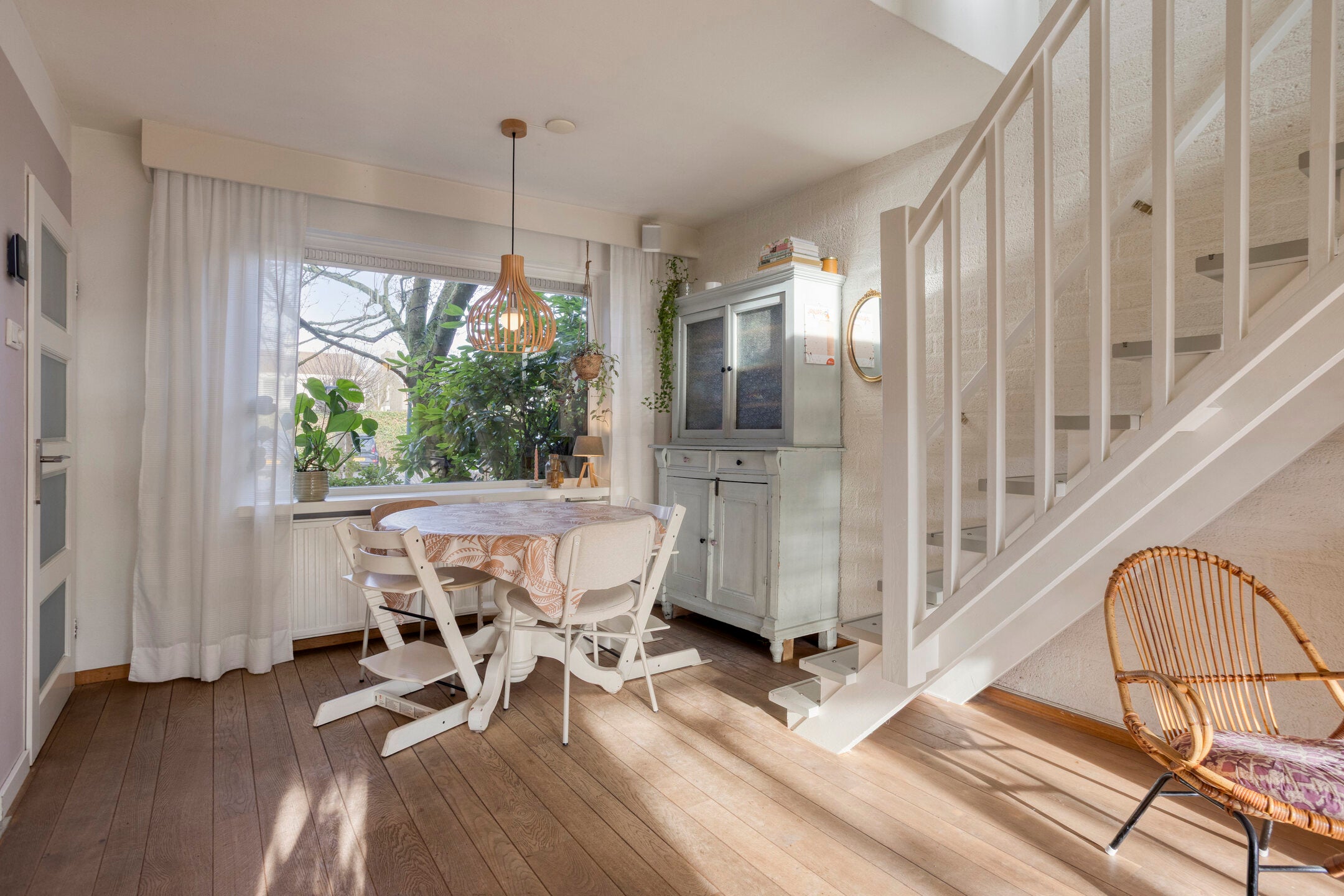 Bij binnenkomst komt u in een hal met veel lichtinval en een praktische berging. De luxe keuken is vernieuwd in 2016 en voorzien van moderne apparaten. De speelse woonkamer heeft een mooie eiken vloer en een open haard.