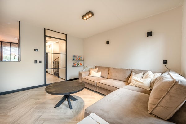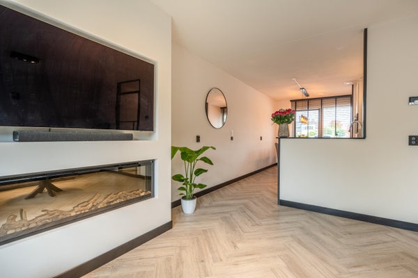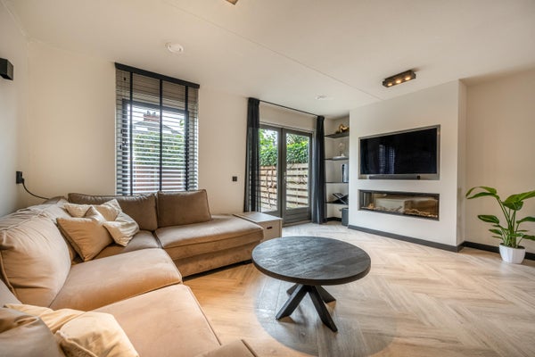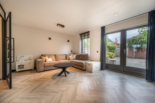 De tuingerichte woonkamer aan de achterzijde van de woning is licht en ruim en heeft gezellige openslaande deuren naar de fijne achtertuin. Ook beschikt de woonkamer over een elektrische haard met verwarmingselementen, wand- en opbouwspots en een sfeervolle pvc-vloer. De vloerverwarming en pvc-vloer zijn in 2021 gelegd.