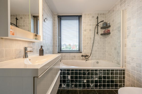 De moderne badkamer is ingericht met een gecombineerd ligbad met douche, een tweede toilet, een wastafelmeubel, verwarming en mechanische ventilatie. De wand- en vloertegels zijn in een neutrale wit/antraciet kleurstelling.