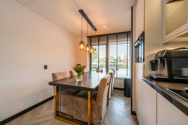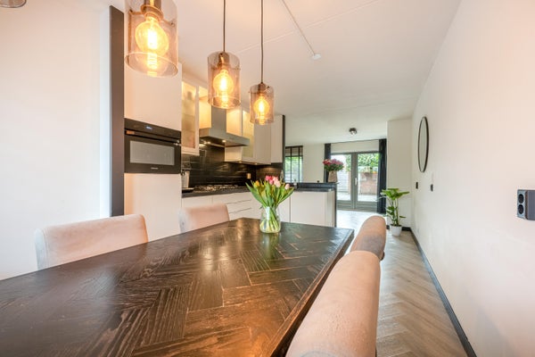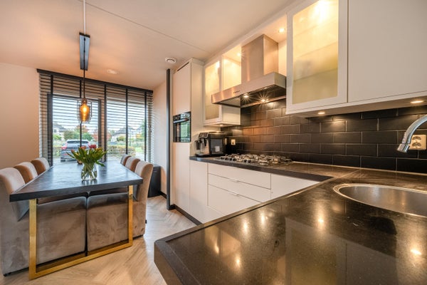 Aan de voorzijde van de woning bevindt zich de moderne open keuken, uitgevoerd in een witte kleurstelling met een zwart stenen aanrechtblad van hoogwaardig quartz. De keuken is voorzien van een combi-oven, koelkast met vriesvak, vaatwasser, 5-pits gasfornuis en een afzuigkap. De combi-oven en vaatwasser zijn beide in 2022 vernieuwd en het gasfornuis is in 2025 vernieuwd.