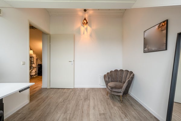 Op de overloop is een praktische opstelplaats voor de wasmachine en droger, ruimte voor de cv-ketel, WTW-unit, mechanische ventilatie en extra bergruimte achter de knieschotten
