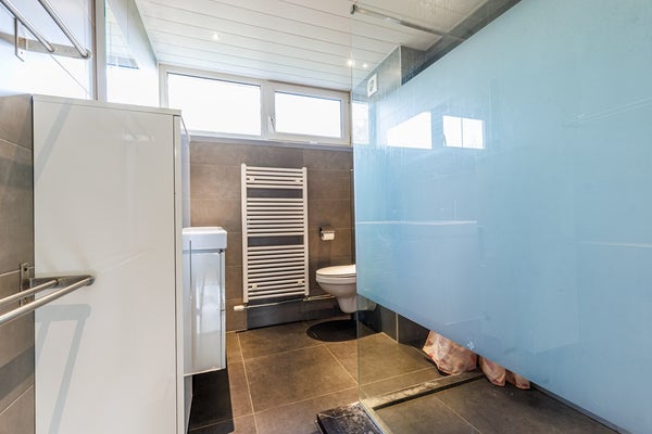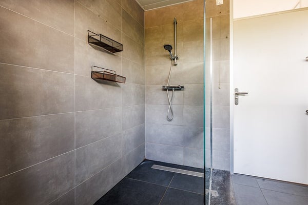 De overloop biedt toegang tot drie goed bemeten slaapkamers en de badkamer. Deze is modern uitgevoerd en uitgerust met een ruime inloopdouche, toilet, dubbele wastafel met meubel, verlichte spiegel, handdoekradiator en een verlaagd plafond met inbouwspots.