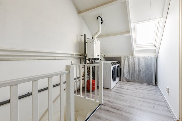 De voorzolder beschikt over een Velux-dakraam, aansluitingen voor wasapparatuur, de opstelplaats van de cv-ketel en extra bergruimte achter de knieschotten. Hier bevindt zich tevens de vierde slaapkamer, eveneens voorzien van een dakraam en handige bergruimte.