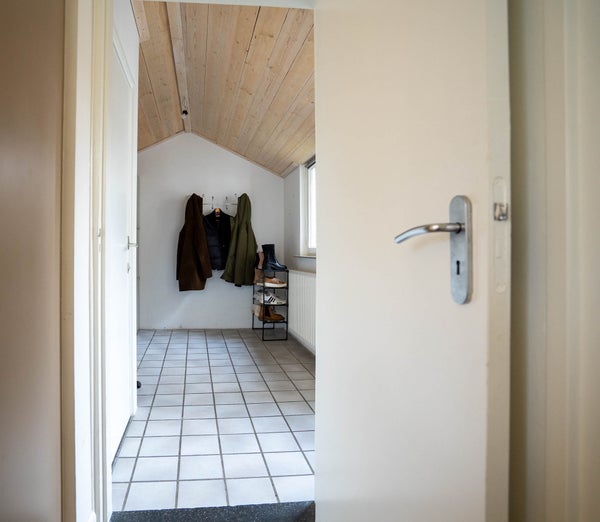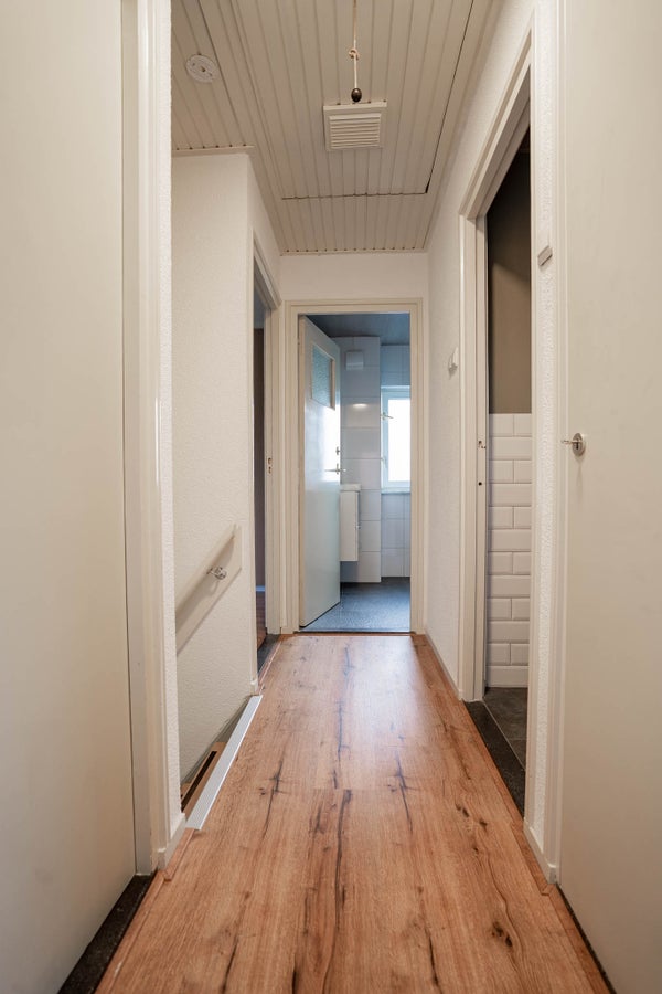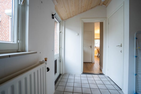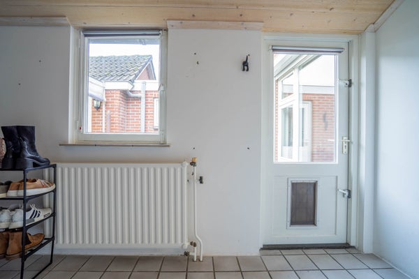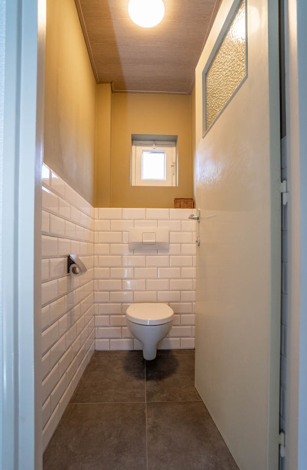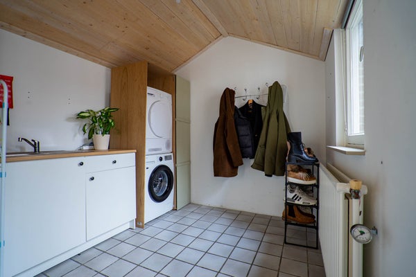 Aansluitend aan de keuken bevindt zich de royale bijkeuken met tegelvloer. Hier vindt u de witgoedaansluitingen, extra opbergruimte en een separate toiletruimte. Een zeer praktische toevoeging aan het wooncomfort.