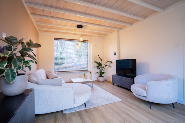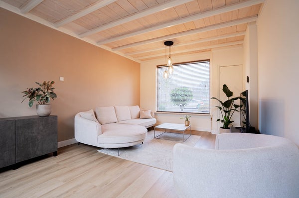De gezellige woonkamer straalt sfeer en warmte uit door de combinatie van een pvc-vloer met vloerverwarming, gestuukte wanden en het karakteristieke plafond met houten balken en planken. De grote raampartijen zorgen voor veel natuurlijke lichtinval, waardoor dit een heerlijke leefruimte is waar u zich direct thuis voelt.