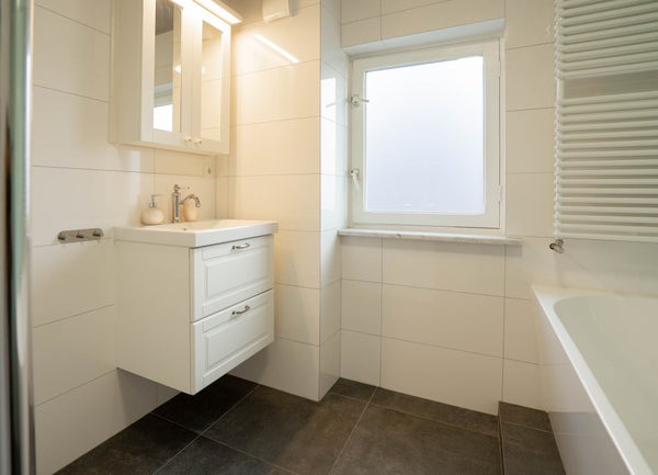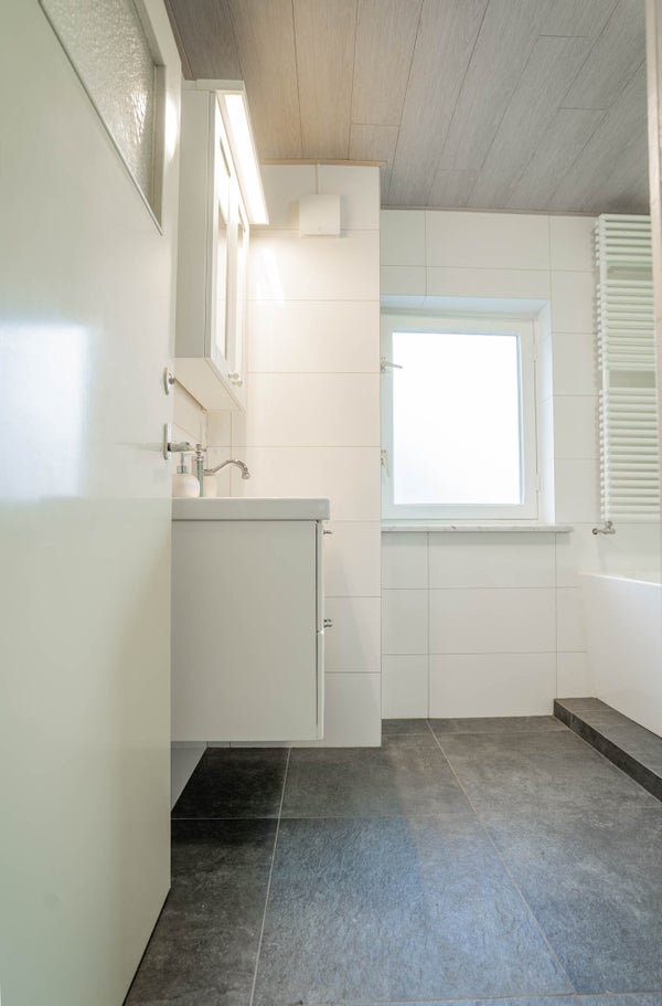 De moderne, goed onderhouden badkamer is volledig betegeld en uitgerust met een wastafel, ligbad en douche. De speelse tegeltjes achter het bad en de douche geven de ruimte een frisse uitstraling. Dankzij het raam kunt u hier prettig luchten.
