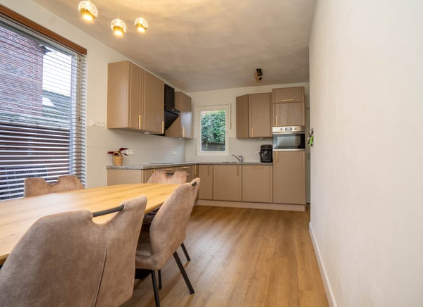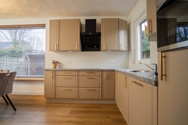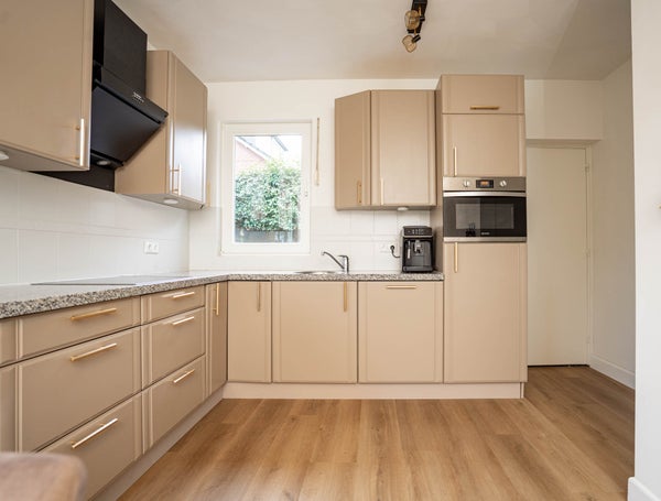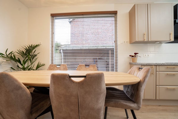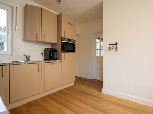 De verzorgde L-vormige keuken beschikt over alle gewenste apparatuur: een inductiekookplaat, koelkast, vaatwasser, combi-oven magnetron en een boiler waardoor je direct warm water hebt. De pvc-vloer met vloerverwarming loopt hier mooi door en dankzij het fijne raam geniet u van extra licht. Er is voldoende ruimte voor een eettafel, waardoor dit een prettige plek is om samen te komen. Fijne ruime kelderruimte voor extra opslag.