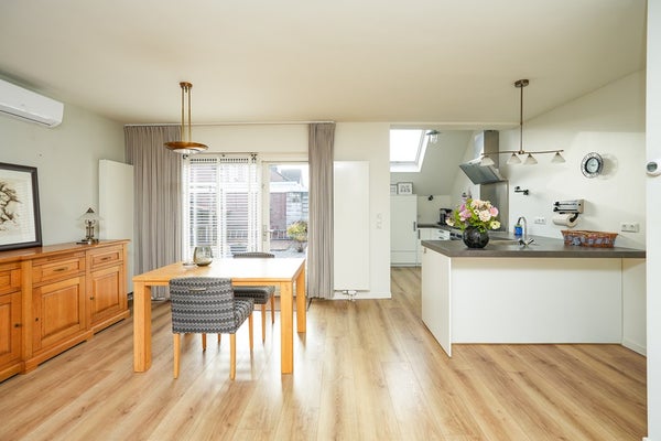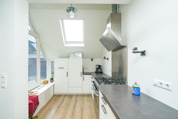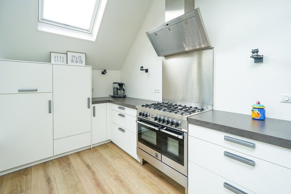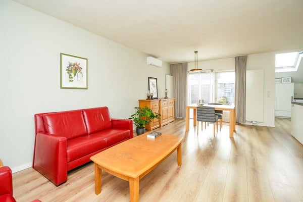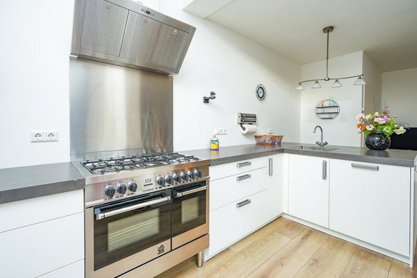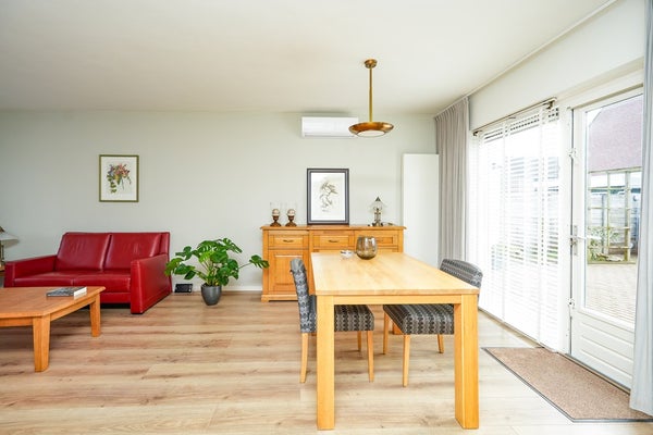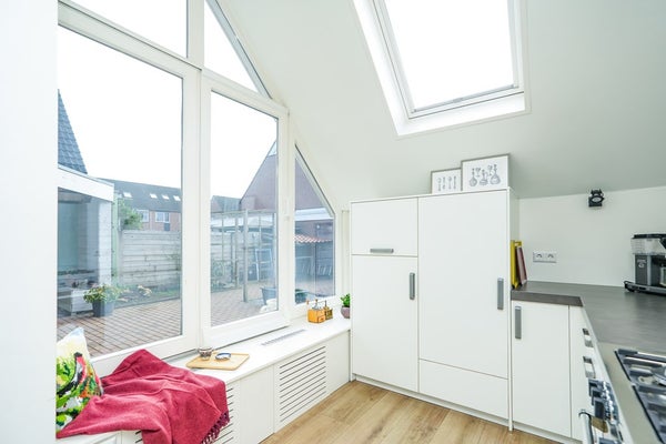 De woning beschikt over een uitbouw aan de achterzijde waarin een moderne keuken is gerealiseerd. Deze keuken is van alle gemakken voorzien, waaronder een zespits gaskooktoestel met een extra grote gasoven. De woonkamer is uitgerust met airconditioning en afgewerkt met een moderne laminaatvloer. Via de deur in de woonkamer is er een naadloze verbinding met de achtertuin, wat het binnen- en buitenleven mooi met elkaar verbindt. Dankzij de grote raampartijen en de volledig beglaasde uitbouw geniet de woning van een optimale lichtinval en een aangename, open leefruimte.