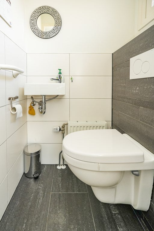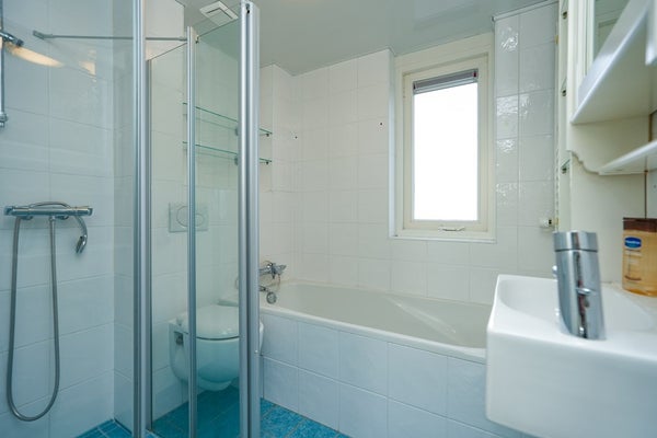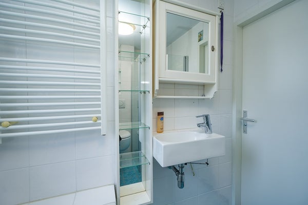 De badkamer is compleet uitgevoerd met een douchecabine, ligbad, hangend toilet, wastafel met spiegelkast en een designradiator en beschikt over mechanische ventilatie. Hoewel de badkamer eenvoudig is uitgevoerd, is deze functioneel en biedt zij volop mogelijkheden om geheel naar eigen smaak te moderniseren.