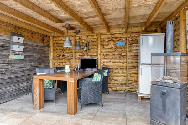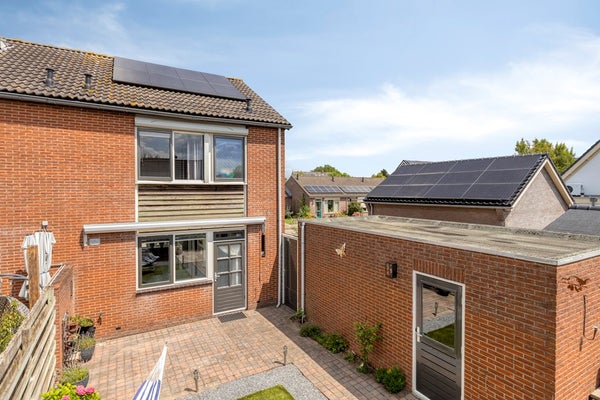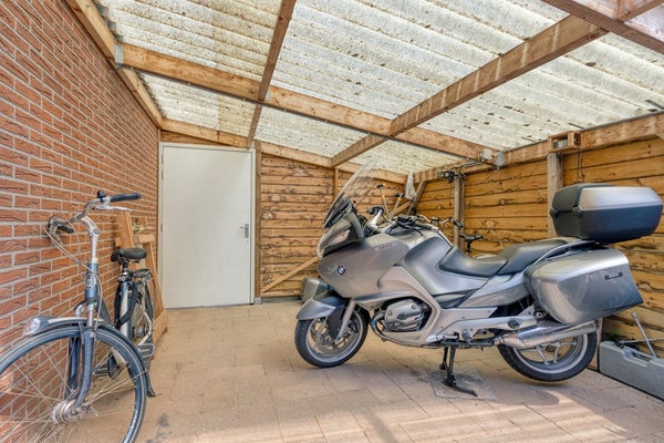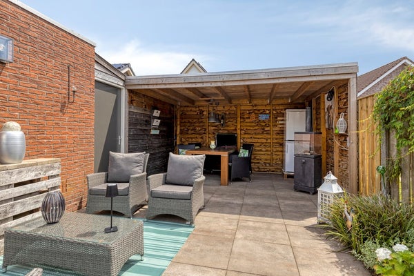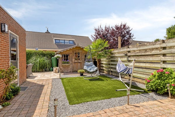 De achtertuin ligt zonnig op het zuid-westen. Er is een veranda en veel berg- en stallingsruimte. Aan de voorzijde is dankzij het brede kavel veel ruimte om eigen auto(s) te parkeren.