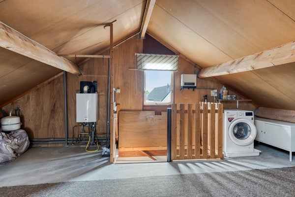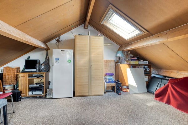Via vaste trap bereikbare ruime zolderverdieping. Hier is de CV-opstelling en de omvormer van de zonnepanelen.